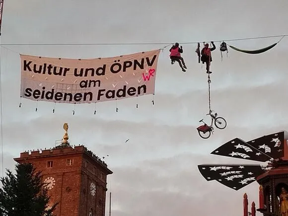 Nachdem die Aktion des Widerstands-Kollektivs vergangenen Samstag (15.11.2025) durch ein Großaufgebot der Polizei verhindert wurde [1], folgt nun die große Überraschung: Die Gruppe hat es doch geschafft auf das Seil des Weihnachtsmanns zu klettern und hier ein großes Banner gegen die Kürzungen in der Kultur und im ÖPNV aufzuhängen. Daneben hängen sie ein KVV-Nextbike an einem scheinbar reißenden Seil.